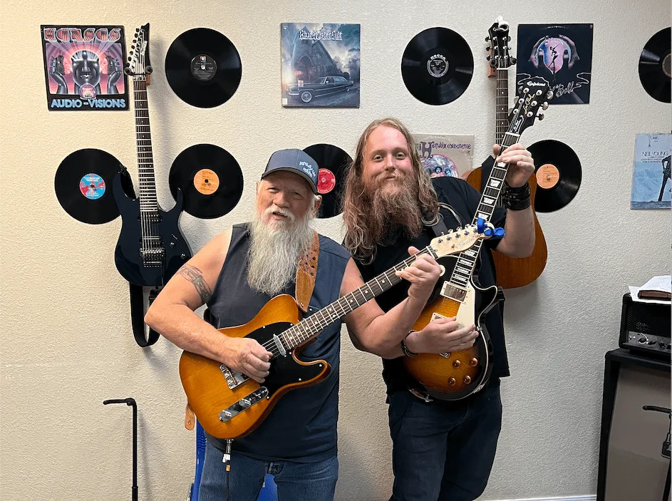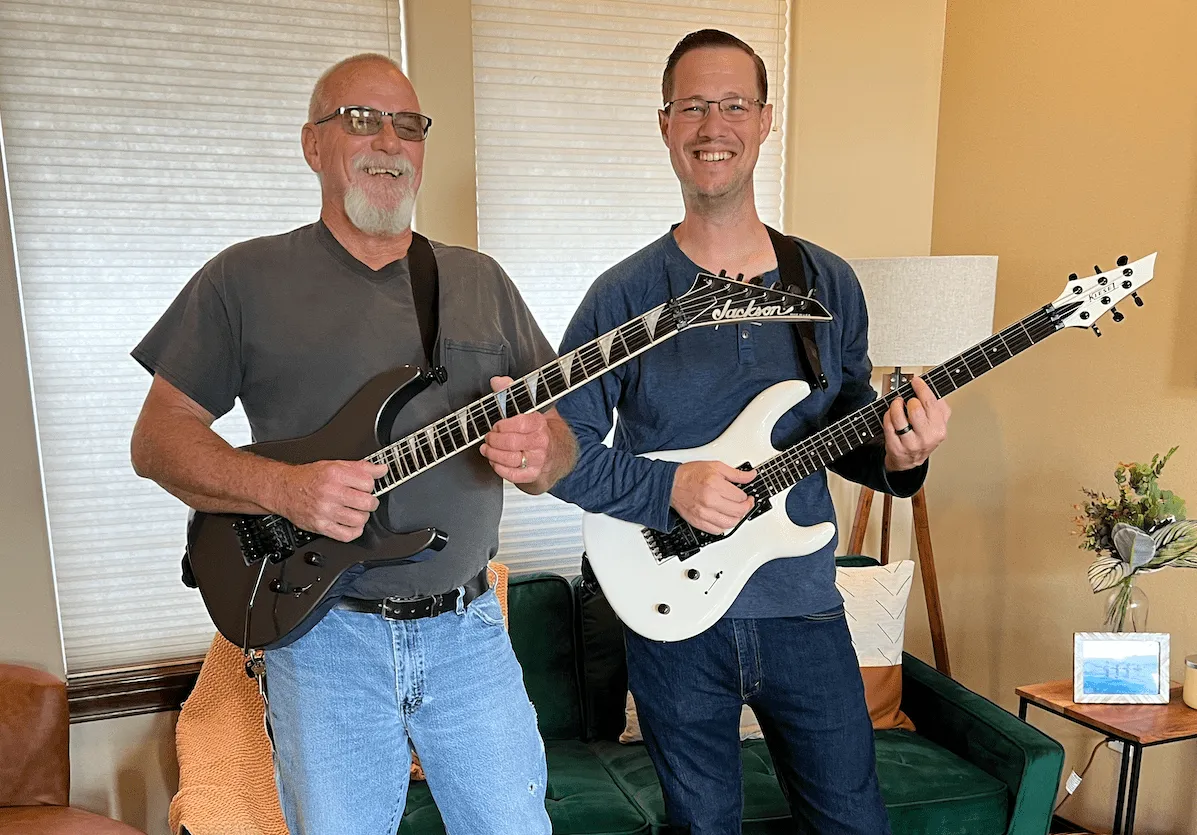 Billy plugged his guitar into his amp, and his dad jumped onto the drum set.